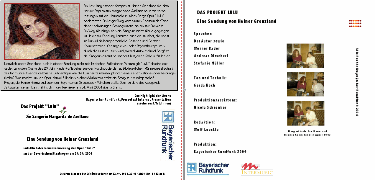 To celebrate the premiere of LULU at the Bavarian State Opera, a remarkable radio portrait was produced by the Bavarian Radio Station in Munich (Bayerischer Rundfunk München): " Das Projekt LULU - die Sängerin Margarita De Arellano "